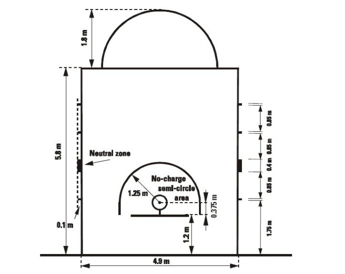 球場(chǎng)兩端標(biāo)有長方形的罰球區(qū),長19英尺(5.79米),寬16英尺(4.88米)。